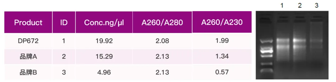 取60 mg 万寿菊花瓣,使用TIANGEN TGuide Smart 高效多糖多酚植物总RNA提取试剂盒(DP672),整合TIANGEN TGuide S16 全自动核酸提取纯化仪(OSE-S16)提取总RNA,100 μl 洗脱。与品牌A 多糖多酚柱法手工提取试剂盒进行平行实验。