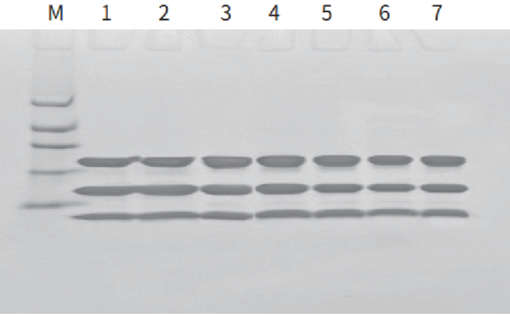磁珠后处理7次纯化目标蛋白的浓度变化 M:蛋白Marker 1-7:7次纯化的目标蛋白