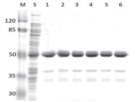 1-6:不同批次磁珠纯化的目标蛋白